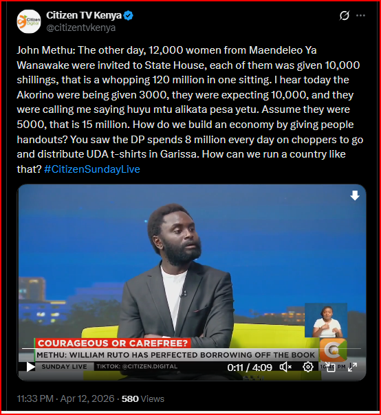 Speaking during an interview on Citizen TV, Methu claimed that during a recent event, 12,000 women from Maendeleo Ya Wanawake were each allegedly given Ksh10,000 at State House, a move he estimated amounted to about Ksh120 million in a single sitting.