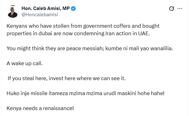 Saboti Member of Parliament Caleb Amisi has criticised President William Ruto following his condemnation of Iran after the Middle Eastern nation launched attacks in response to strikes by the United States and Israel.