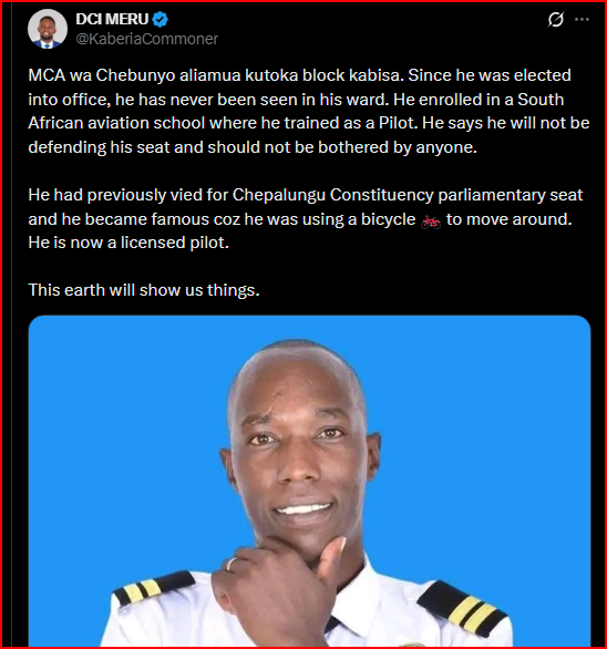 According to reports, the MCA has rarely been seen in the ward, opting instead to pursue aviation training in South Africa, where he has since qualified as a licensed pilot.