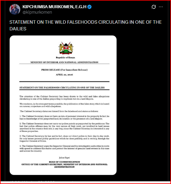 In a statement posted on his official X account, Murkomen denied having any interest in the 300-acre property, adding that he is not even aware of its exact location.