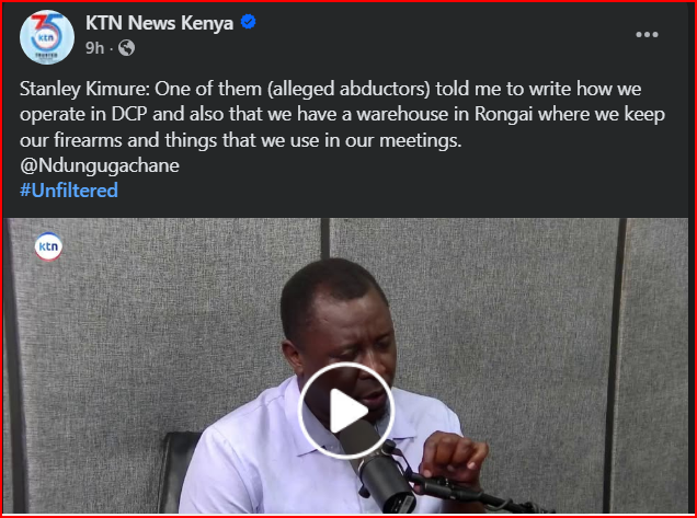 Speaking during an interview on KTN, Kimure recounted a tense encounter, saying one of the alleged abductors pressured him to write a statement detailing how the party supposedly operates.