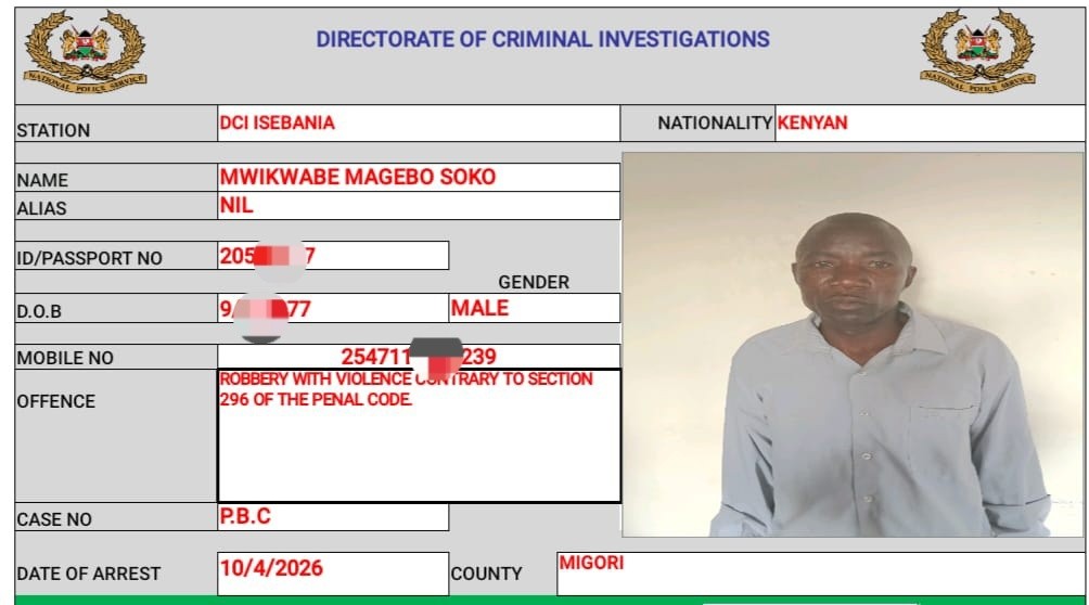 Preliminary investigations indicate that the first suspect is a habitual offender with several cases pending before the Kehancha Law Courts.
