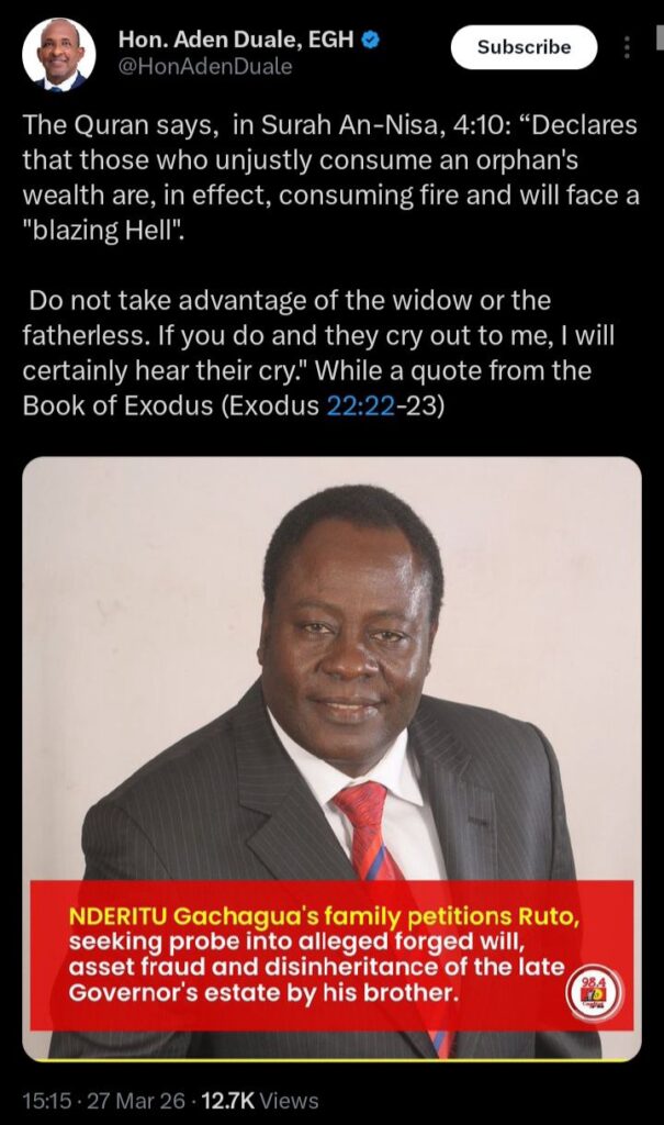 Taking to his X account, Duale invoked both Qur’anic and biblical teachings, emphasizing the protection of vulnerable members of society, particularly widows and orphans.
