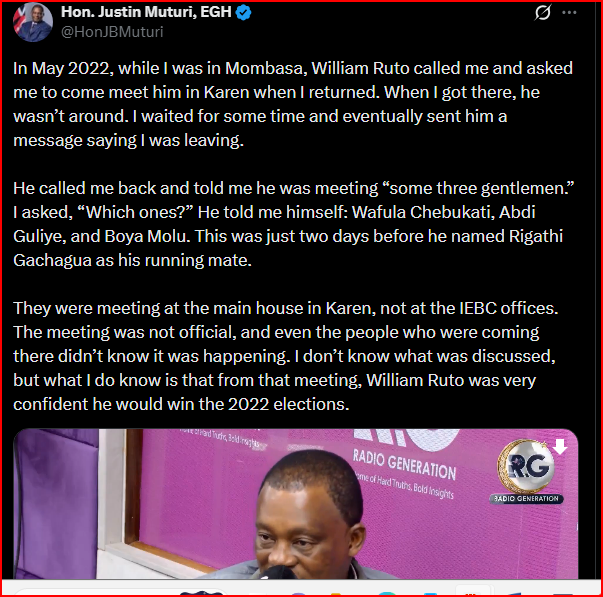 Former Attorney General Justin Bedan (JB) Muturi has made explosive claims about a private meeting allegedly held between President William Ruto and top Independent Electoral and Boundaries Commission (IEBC) officials shortly before the 2022 General Election.
