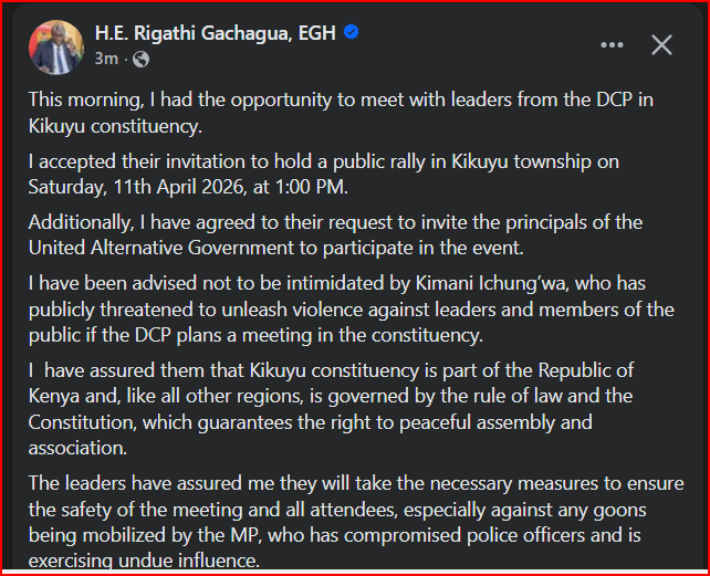 “I have been advised not to be intimidated,” he said, adding that Kikuyu Constituency remains part of Kenya and is governed by the Constitution, which guarantees the right to peaceful assembly and association.