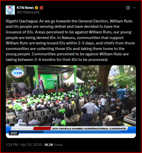 “In Nakuru, communities that support William Ruto are being issued IDs within 2–3 days, and chiefs even deliver them directly. But in areas perceived to be against him, the process takes 3–4 months,” he claimed.