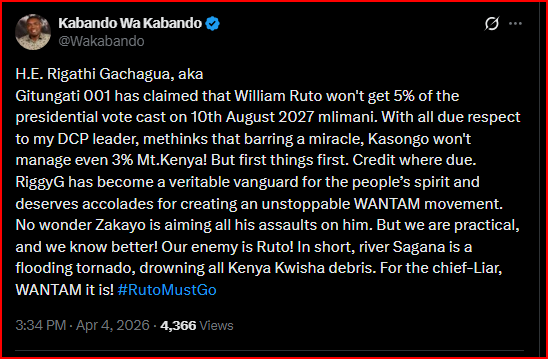 Kabando credited Gachagua for rallying Mt Kenya residents to the opposition through the “WANTAM” movement.