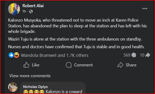 According to claims shared by blogger Robert Alai, Kalonzo, who had initially declared he would “not move an inch” from the station, later departed alongside his entourage, leaving Tuju behind.