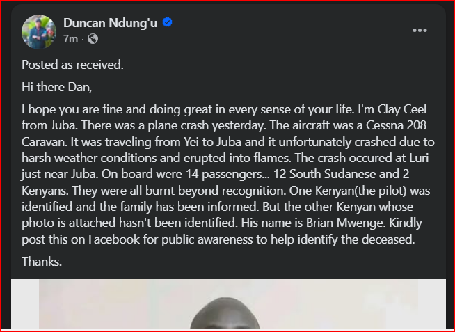 Reports circulating online indicate that a Kenyan pilot is among those who died in a plane crash involving a Cessna 208 Caravan that was travelling from Yei to Juba, South Sudan.