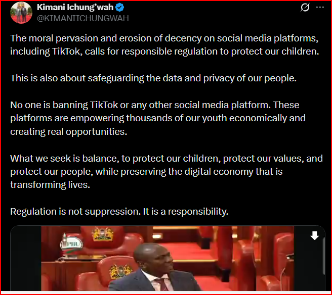 “The moral pervasion and erosion of decency on social media platforms, including TikTok, calls for responsible regulation to protect our children,” Ichung’wah stated.