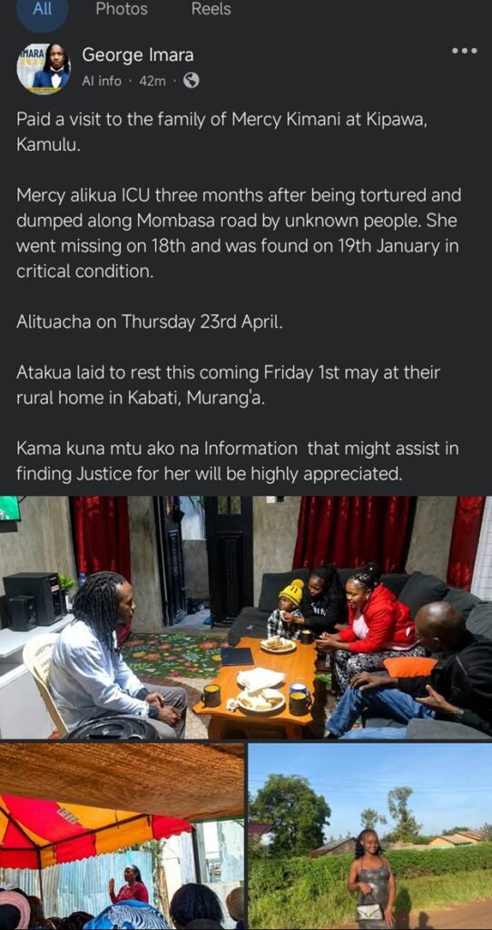A grieving family is calling for justice following the death of their 23-year-old daughter, Mercy Kimani, who was severely assaulted and left by the roadside.