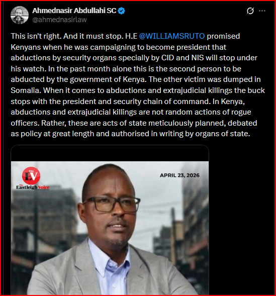 “This isn’t right. And it must stop,” Ahmednasir stated, directly calling out the Head of State and the country’s security agencies over the reported cases.
