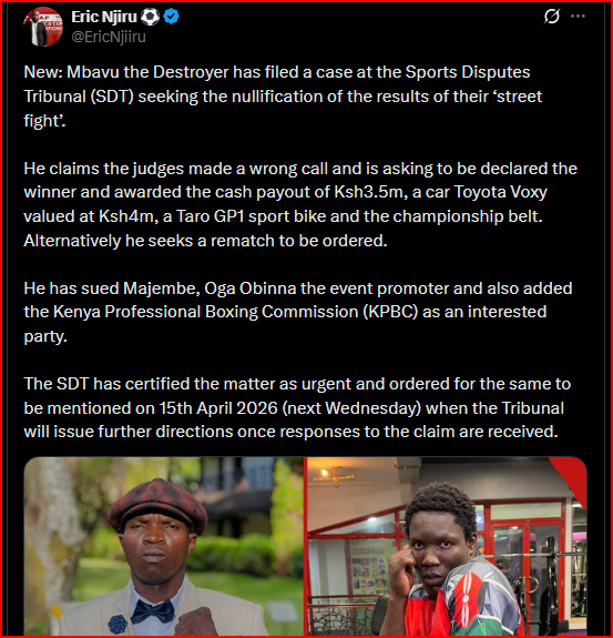 Mbavu The Destroyer has filed a case at the Sports Disputes Tribunal (SDT) seeking the nullification of the results of his controversial ‘street fight’ with Majembe.
