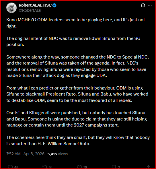 In a post shared on his X account, Alai suggested that the original intention of a recent National Delegates Conference (NDC) was to remove Sifuna from his position as Secretary General.