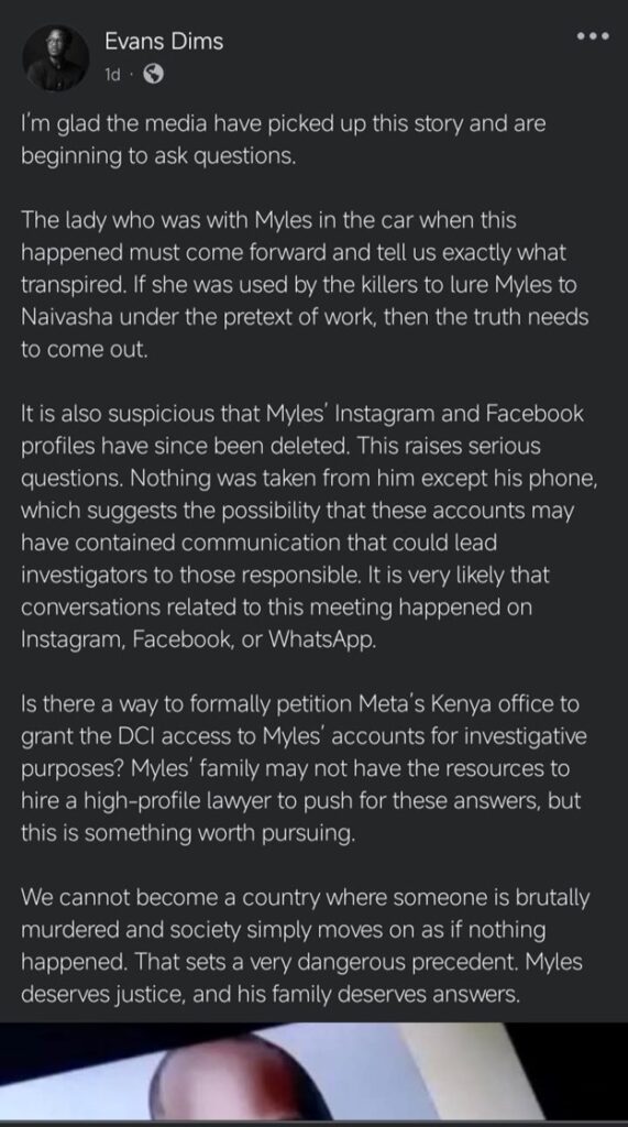 “If she was used by the killers to bring Myles to Naivasha, then the truth needs to come out,” the friend said, urging investigators to thoroughly question anyone who was in contact with him before his disappearance.