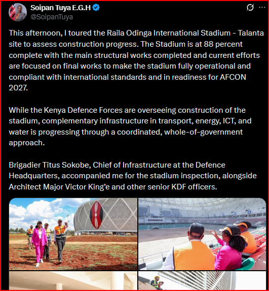 Cabinet Secretary for Defence Soipan Tuya has expressed satisfaction with the progress of the Raila Odinga International Stadium , revealing that construction is now 88 percent complete.